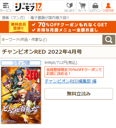 そのクーポンを利用すれば「チャンピオンRED・2022年4月号」(712円)が1冊70%オフ(=214円)で読めます。