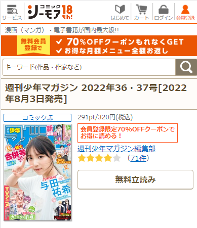 そのクーポンを利用すれば「週刊少年マガジン・2022年36・37号」(税込320円)が1冊70%オフ(=税込96円)で読めます。