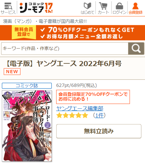 そのクーポンを利用すれば「ヤングエース・2022年6月号」(689円)が1冊70%オフ(=207円)で読めます。
